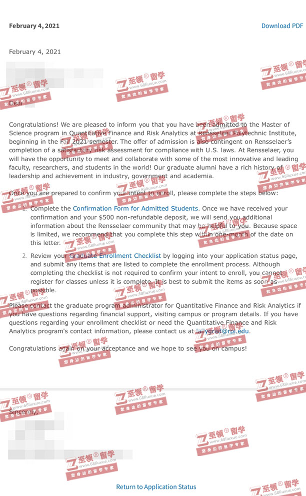 录取结果:RPI,M.S. in Quantitative Finance and Risk Analytics伦斯勒理工大学定量金融和风险分析硕士录取