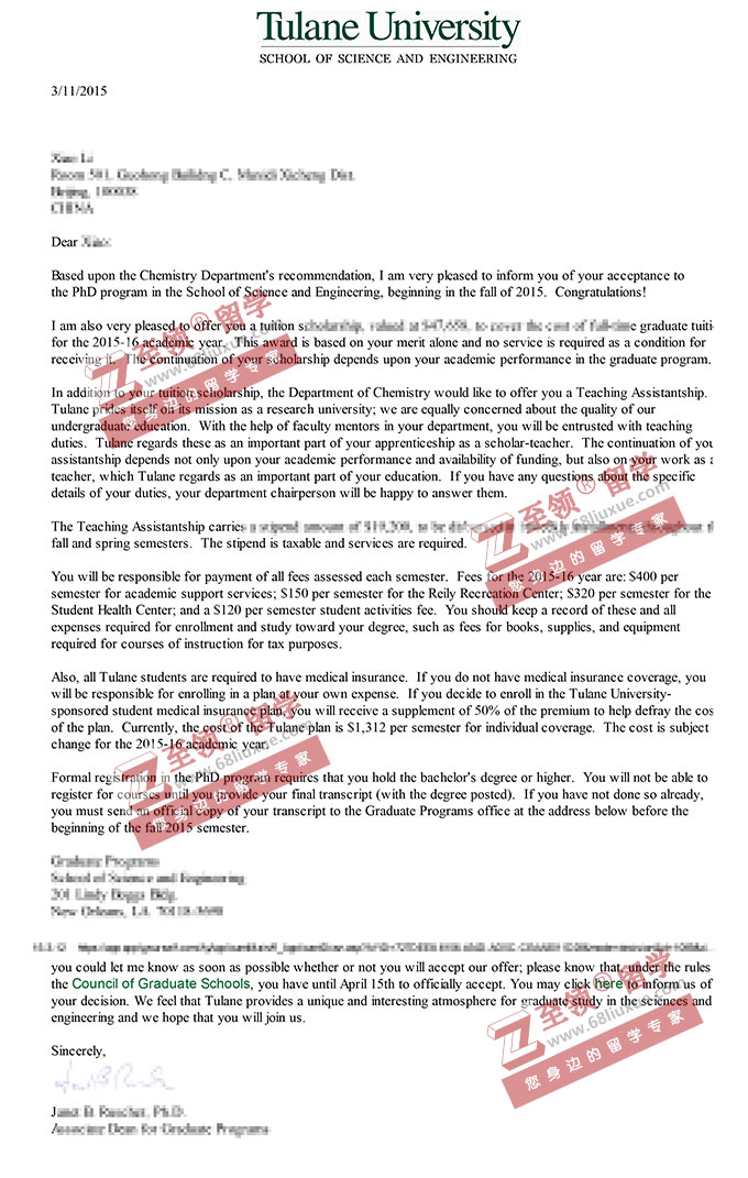 录取院校:杜兰大学 化学Phd 全奖录取 (tuition scholarship:$47658 + TA $19200)
