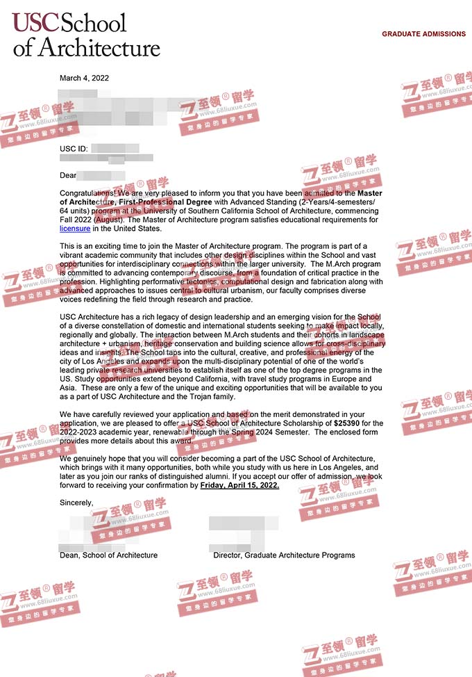 录取结果:University of Southern California,M. Arch with Adv. Standing-2yr 南加州大学建筑学硕士录取+奖学金$25390