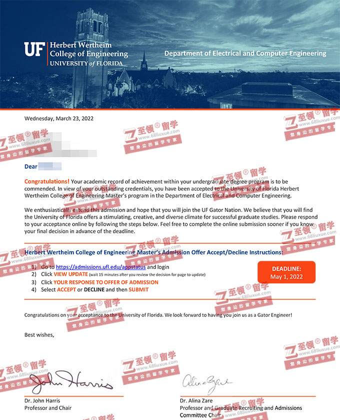 录取结果:University of Florida,Master of Science in Electrical and Computer Engineering 佛罗里达大学电子工程硕士录取+奖学金4500美金