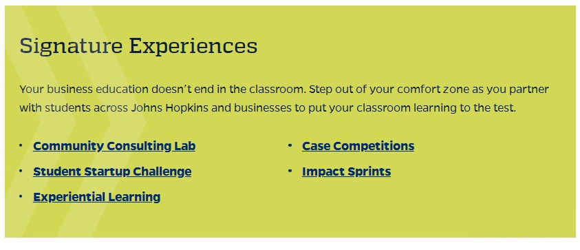 JHU Carey商学院下开设的Marketing 硕士项目也是众多学生申请的目标项目之一。项目总时长1年,marketing analytics方向是STEM designated. JHU营销硕士结合了对消费者行为,大数据,分析,新技术和说服心理学的深刻见解,揭示当代营销内在原理。此外,该硕士课程还会涉及很多当今市场面临的争议性话题的讨论,如超短产品生命周期,市场进入与退出战略,战略风险管理,以及产品营销等等。