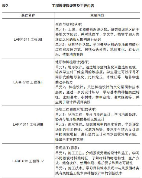 宾大景观设计系工程课(表2)是有关场地工程和生态技术的课程,主要学习景观材料特性及其物质形态转换过程。学习内容包含4个知识单元:第一个知识单元是了解景观材料(岩石、土壤、植物、水、木材、混凝土、沥青、钢等)的基本特性;第二个知识单元是认识和分析景观材料的物理特性,包括材料的可塑性和重组性;第三个知识单元是关于材料特性的转变和设计师意图的表达;第四个知识单元是关于触觉感知,涉及手工技巧和工艺方面的知识。