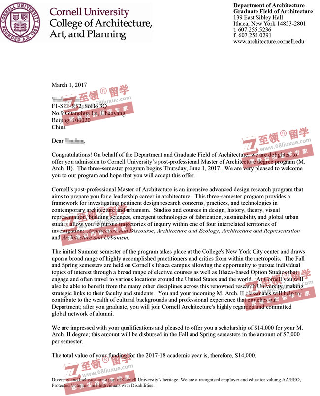 录取结果:康奈尔大学,M. Arch. II,奖学金$14,000