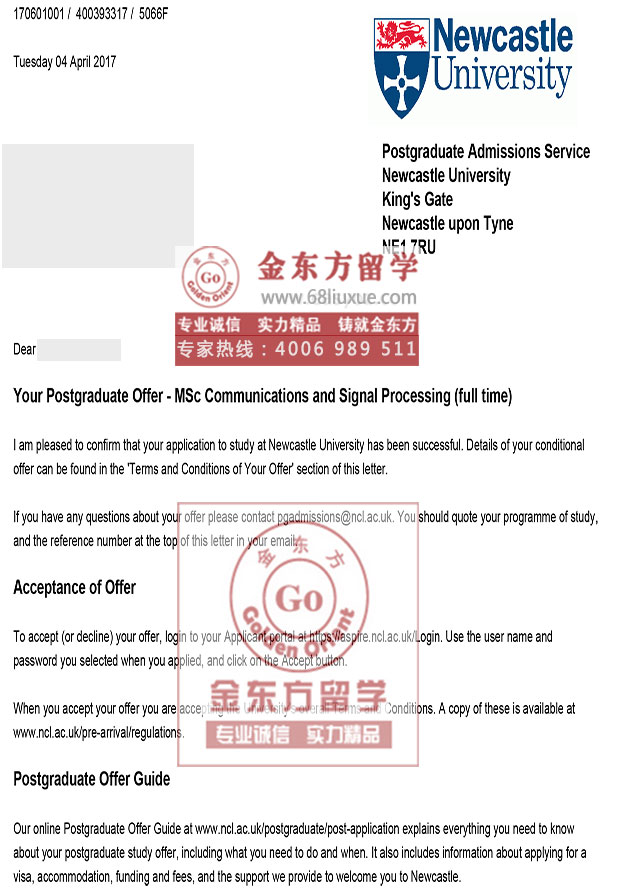 录取结果: Newcastle University纽卡斯尔大学, MSc Communications and Signal Processing Conditional通信与信号处理硕士