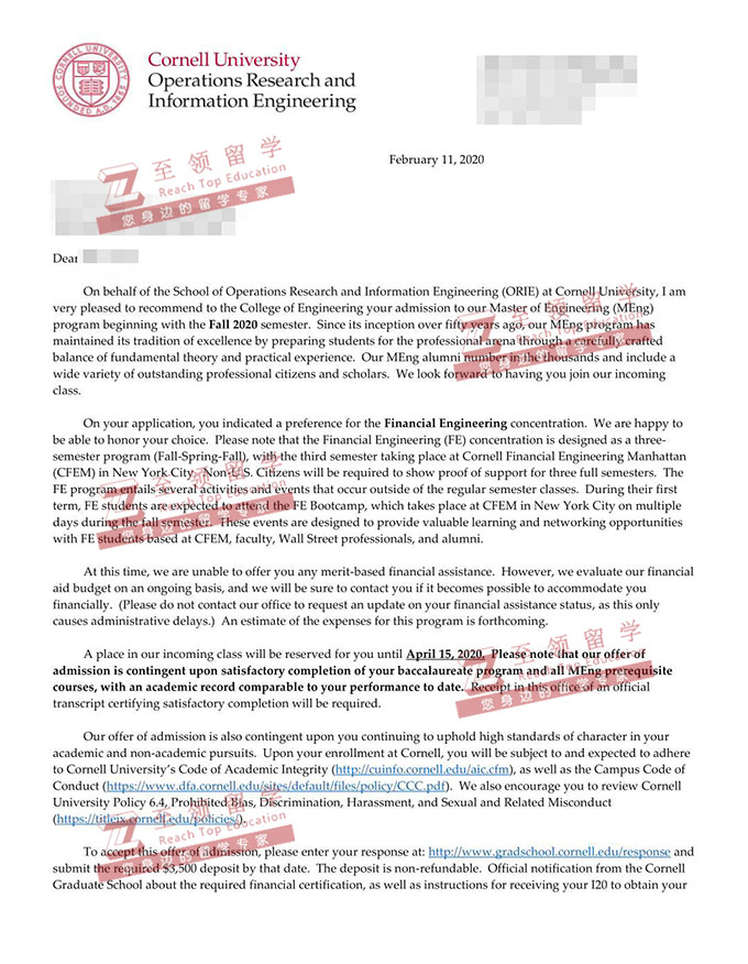 录取结果:Cornell University,Master of Engineering of Financial Engineering Concentration康奈尔大学金融工程硕士录取